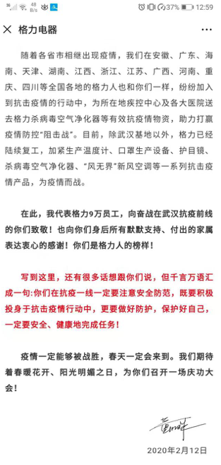 董明珠在一封给武汉格力全体员工的慰问信中,表示格力正为“抗疫”而战。无独有偶,近日央视也播出了一条《格力电器:用核心技术产品驰援抗疫一线》的信息:为同舟共济助力打赢全民战“疫”,格力电器坚持发挥优势,主动作为,多做贡献,组织公司全员向湖北疫区捐款,并捐赠大批新风空调和空气净化器,同时格力各销售公司也纷纷向各地捐赠了空气净化器,至今捐赠数量还在不断增加。