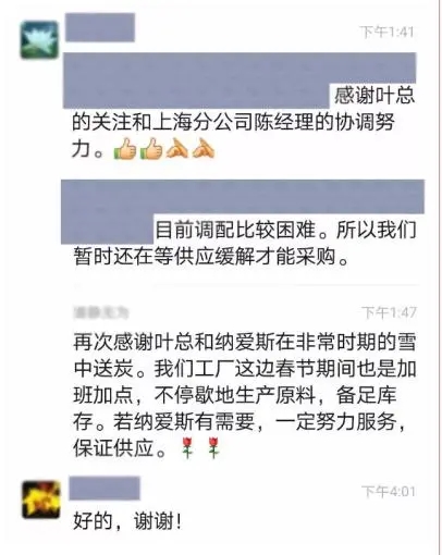 晚上,巴斯夫负责人陈总发来信息,再次感谢纳爱斯集团和叶副总裁在非常时期的雪中送炭,感谢上海分公司全体工作人员的协调和努力,第一批45箱的纳爱斯防疫产品已顺利收到了。巴斯夫工厂也在加班加点,不停歇生产原料,备足库存。若纳爱斯有需要,一定努力服务,保证供应!