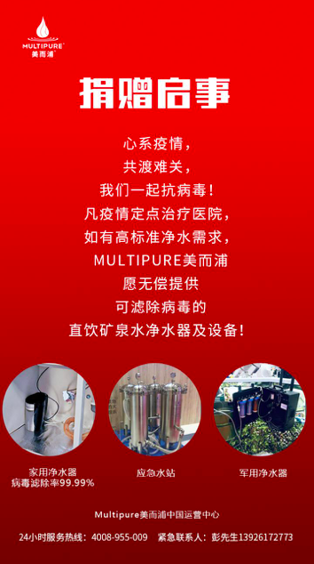 武汉疫情爆发之后,美而浦第一时间启动了捐赠计划,于1月25日年初一发布净水设备捐赠启事,愿意为疫情定点医院无偿提供高性能的净水设备。