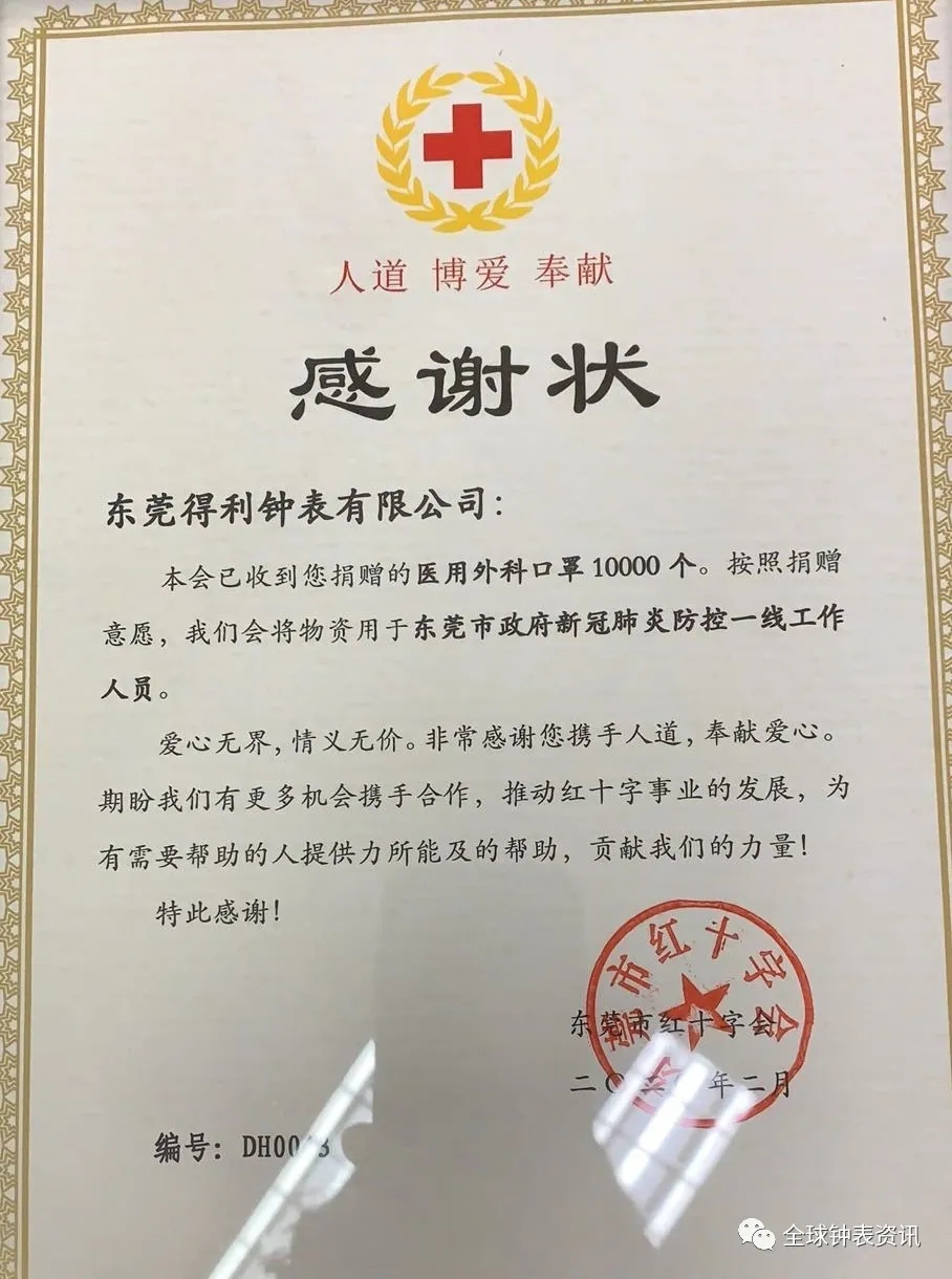随着疫情的持续,各类防控物资日益匮乏,尤其是从一线防控到一般市民都会使用的口罩更是持续紧张。近日,得利钟表集团捐赠医用外科口罩10,000 个予东莞市红十字会,指定用于「东莞市政府新冠肺炎防控一线工作。」