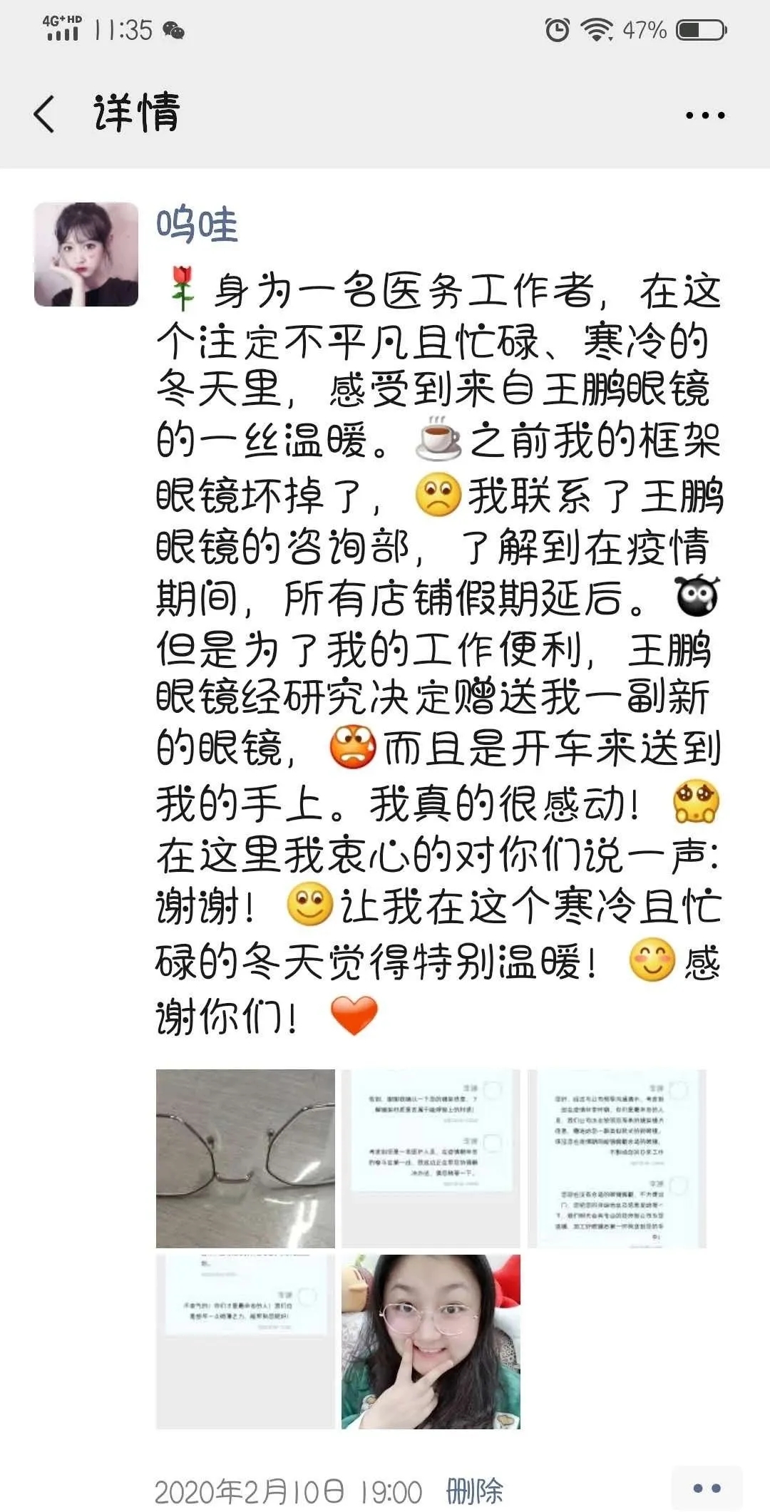 小小的一副眼镜,就这样带着王鹏人的爱心,把温暖和信念传递到了抗疫时期一线医护人员的手中。收到新眼镜的王静十分感动,她把这个眼镜的故事发到了朋友圈里,并写道:“身为一名医务工作者,在这个注定不平凡且忙碌、寒冷的冬天里,感受到来自王鹏眼镜的温暖……”