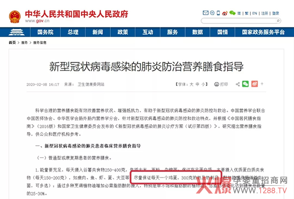 疫情期间,中华人民共和国中央人民政府网站、国家卫健委官网均发布了《新型冠状病毒感染的肺炎防治营养膳食指导》(以下简称“膳食指导”),对新冠肺炎感染者、一线医务人员和一般人群均提供了相应的营养支持方案,其中主要提到了常规的蔬菜、水果、肉类、水产、大豆等之外,重点提出了“尽量保证每天一个鸡蛋、300克奶及奶制品”。同时,牛奶被国家发改委列为疫情防控重点保障物资。