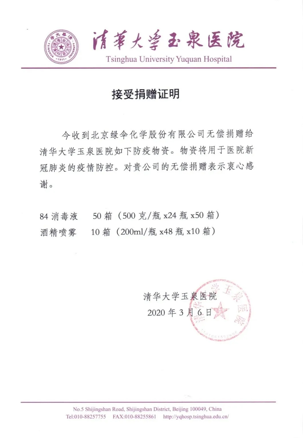 对此,绿伞化学董事长魏建华表示,抗击疫情是我们每一个人的责任,作为消杀产品生产企业更是责无旁贷。2003年非典疫情爆发,绿伞化学就积极捐款捐物,为北京抗击非典作出了贡献。现在企业壮大了,实力更强了,更要以感恩之心回报社会,通过捐赠消杀物资,向医务人员传递爱的力量。
