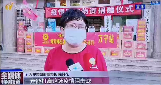 “(椰岛的公益活动)体现了企业一方有难八方相助的社会责任担当,我们坚信,在以习近平同志为核心的党中央坚强领导下,在社会各界鼎立支持下,我们万众一心、众志成城,一定能打赢这场疫情阻击战。”——万宁市政府副市长 陈月花