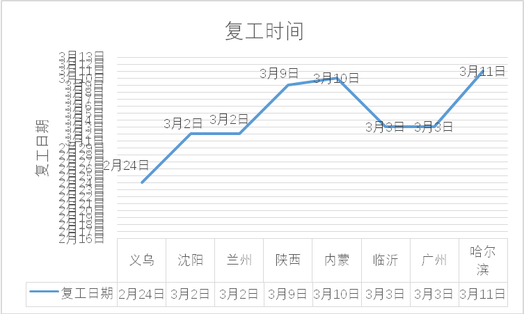 八大文教办公用品专业市场复工复产时间多数集中在3月2日左右,义乌最早,2月24日就已复市。中西部内蒙兰州地区稍晚,基本在3月10日前后。