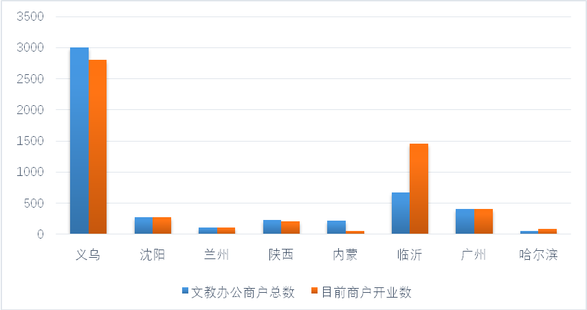 义乌、临沂、广州三大物流集散地,文教办公用品专业商户分别达3000、600、400余户。内销型市场,商户数量受历史原因、地理位置、消费水平及交通等因素影响普遍较低,平均在200户左右。