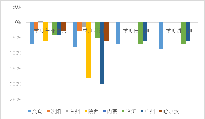 第一季度营业收入除兰州上涨5%外,普遍下降30%-70%,平均降幅33%。第一季度利润,普遍大幅度下降,平均降幅77%,其中陕西和广州下降极其严重,分别为-180%和-200%。第一季度出口额,三家内外销并重市场下降60%-70%,平均降幅67%。4、第一季度进口额,三家内外销并重市场下降60%-85%,平均降幅72%。