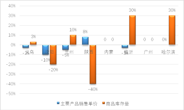 主要产品销售单价,除陕西上涨8%外,普遍价格下降,平均降幅2%左右。商品库存,各地市场增减不一,其中义乌增加3%、兰州增加10%、临沂增加30%、哈尔滨增加30%;沈阳减少20%、陕西减少40%。