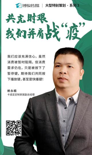 疫情之下,卡诺亚联手家居行业上下游产业链各种资源,为中国家居提振信心助威呐喊,为战胜疫情一起加油!卡诺亚定制家居副总经理兼营销中心总经理赖永精、营销中心副总经理李伟明分别接受媒体采访,与多家媒体联合发声,和众多家居企业一起并肩战“疫”,呼吁同行积极思考、理性经营,专注做好自己的事情,提高企业疫情危机下的免疫力和综合竞争力。