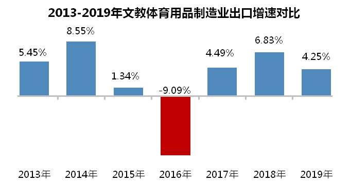 2019年,全国文教体育用品制造业累计完成出口额445.05亿美元,同比增长4.25%,增速比上年下降2.58个百分点,比同期轻工业出口增速低1.14个百分点。