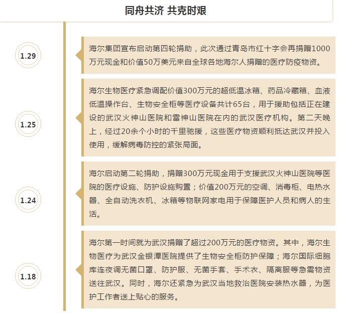 1月29日,海尔集团宣布启动第四轮捐助,此次通过青岛市红十字会再捐赠1000万元现金和价值50万美元来自全球各地海尔人捐赠的医疗防疫物资。