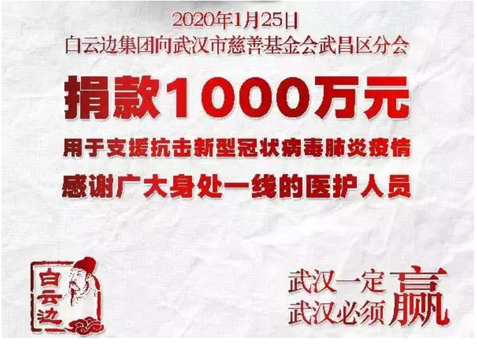 1月25日,白云边集团向武汉市慈善基金会武昌区分会捐款1000万元,用于支援抗击新型冠状病毒肺炎疫情。