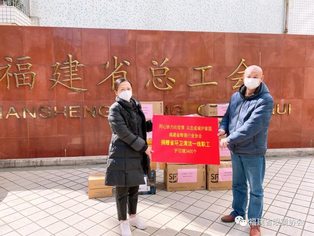 2月14日我会与省总工会共同发起“防控疫情,保障环卫工人安全——为奋战在第一线的环卫工人捐赠防护物资活动”,福建省眼镜协会会长、理事、监事等单位共征集捐赠护目镜3400付。