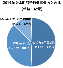 2019年,全国文教体育用品制造业完成营业收入3094.37亿元,同比增长4.48%,高于轻工全行业平均增速1.65个百分点。全年累计完成出口交货值932.44亿元,同比增长3.21%。 在国家一系列鼓励消费的政策推动下,文体用品制造企业积极响应“三品”战略,努力拓展国内市场,推动国内市场消费升级。2019年,文教体育用品外销占比30.1%,内销占比69.9%,内销市场占比较上年扩大0.6个百分点,对行业的拉动作用显著。(注:外销占比由出口交货值/营业收入得出,其余部分视为内销占比。)从子行业看,2019年文教办公用品制造完成1522.36亿元(占49.20%),同比增长6.78%,比文体用品制造全行业平均增速高2.3个百分点;体育用品制造完成营业收入1177.79亿元(占38.06%),同比增长3.54%,低于文体行业平均增速0.94个百分点;游艺器材及娱乐用品制造完成394.22亿元(占12.74%),同比下降1.05%。