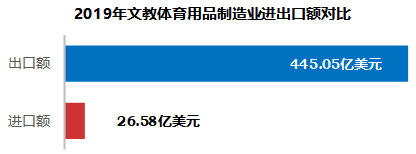 2019年,全国文教体育用品制造业累计完成出口额445.05亿美元,同比增长4.25%,增速比上年下降2.58个百分点,比同期轻工业出口增速低1.14个百分点。