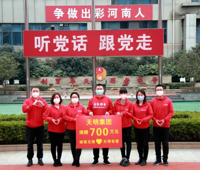 2月5日,天明集团捐助700万元善款支持河南郑州抗击新型冠状病毒感染肺炎疫情,其中:300万元用于奖励在河南疫情防控阻击战中做出突出贡献的医护工作者;300万元联合微医集团补贴为“新型冠状病毒实时救助平台”河南专区提供义诊的医生;另外100万元定向捐助给信阳,用于奖励信阳市及固始、光山等8县2区6个管理区的疫情防控阻击战中做出突出贡献的医护工作者,支持信阳疫情防控! 详细
