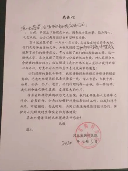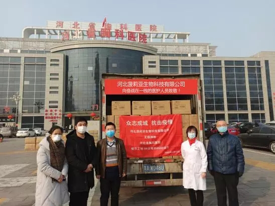 一场突如其来的新冠肺炎疫情在全国蔓延,全体中华儿女举国同心、义无反顾地投入到抗击新冠病毒肺炎疫情的战斗中,而广大医务工作者们更是冲在了抗“疫”最前线。菠莉亚公司作为河北省疫情防控物资重点生产企业,深知社会责任重大。在得知河北省疫情防治定点医院——河北省胸科医院消毒用品紧缺的信息后,公司积极与该院联系对接,无偿捐赠84消毒剂,支持该院的新冠肺炎疫情防控工作。2月13日上午,公司将300箱(4500公斤)橙乐工坊84消毒液向该院进行了交付。