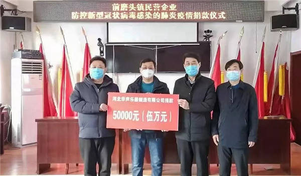 新型冠状病毒感染肺炎疫情发生以来,河北衡水市非公有制企业踊跃捐款捐物,以实际行动为疫情防控贡献力量。2月2日,前磨头镇收到河北华声乐器制造有限公司捐款5万元,张立根捐款1万元。市委常委、宣传部长范龙海、前磨头镇主要负责人出席了捐赠仪式。捐赠活动号召全市上下学习他们的无私奉献精神,全力以赴投入疫情防控中,坚决打赢这场疫情防控战争。