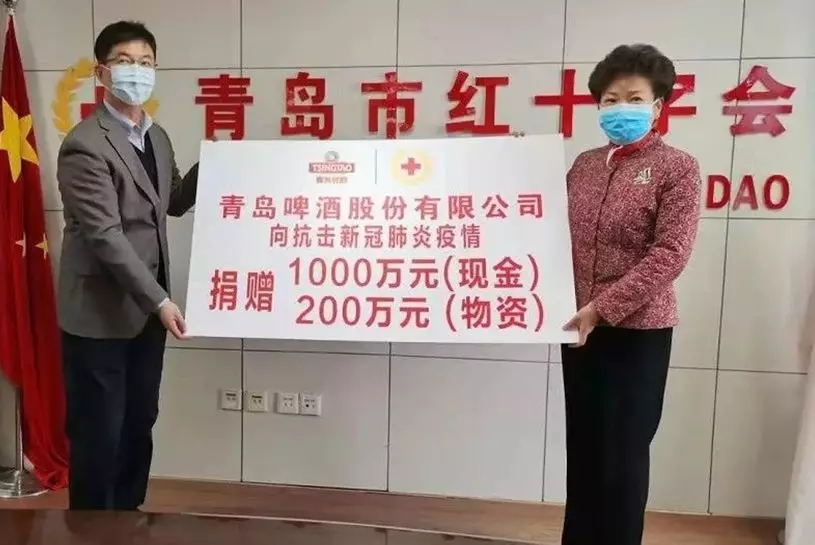 1月29日,青岛啤酒股份有限公司向青岛市红十字会捐赠现金1000万元及价值200万元的物资,用于疫情防控工作。在捐赠现场,青岛啤酒股份有限公司党委副书记于嘉平表示,青岛啤酒作为负责任的企业公民,在全国上下共克时艰的关键时刻,以自己的绵薄之力,与疫情防控一线齐心奋战,责无旁贷。团结一心,其利断金!青岛啤酒公司将坚决贯彻落实各项抗击疫情的部署安排,在切实保障广大人民群众与员工健康和安全的基础上,积极履行社会责任,以实际行动为疫情防控工作贡献青啤力量。新型冠状病毒感染的肺炎疫情发生以来,青啤公司党委坚决贯彻落实习近平总书记关于疫情防控的重要指示精神,公司各级党组织和广大党员干部积极响应号召,在疫情防控中亮身份、当先锋,发挥基层党组织的战斗堡垒作用和广大党员“1+N”模范引领作用,奋力投身疫情防控阻击战。