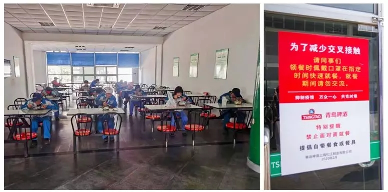 青岛啤酒厂、郴州公司等各个工厂严格落实生产办公区域准入制度,对进入厂区的复工复产员工和外来进出车辆、人员一律进行体温检测和身份登记,体温正常方可进入。每日在上班前、下班后,对车间、办公场所、人员集中区域进行定时消毒。