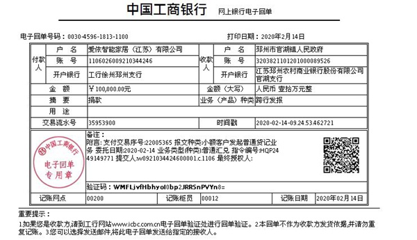 抗击新型冠状病毒,爱依瑞斯在行动。2月14日,爱依瑞斯向邳州市官湖镇人民政府捐款10万元,为新型冠状病毒疫情防控献爱心做贡献!这是继1月29日捐款以来的再一次专项资金援助,在助力疫情防控路上,爱依瑞斯竭尽所能,为社会奉献自己的绵薄之力!