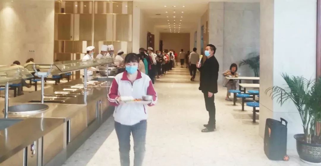 食堂也是防疫工作重要的一环,目前国台食堂做好分散、分时段就餐,消毒、体温检测等日常性、规定性防疫举措,员工们戴着口罩保持安全距离排队取餐,随后互相背对有序进餐。公司再次强调,必须为一线员工做好后勤服务保障,员工干体力活,要保证让员工们吃得健康、吃得营养。