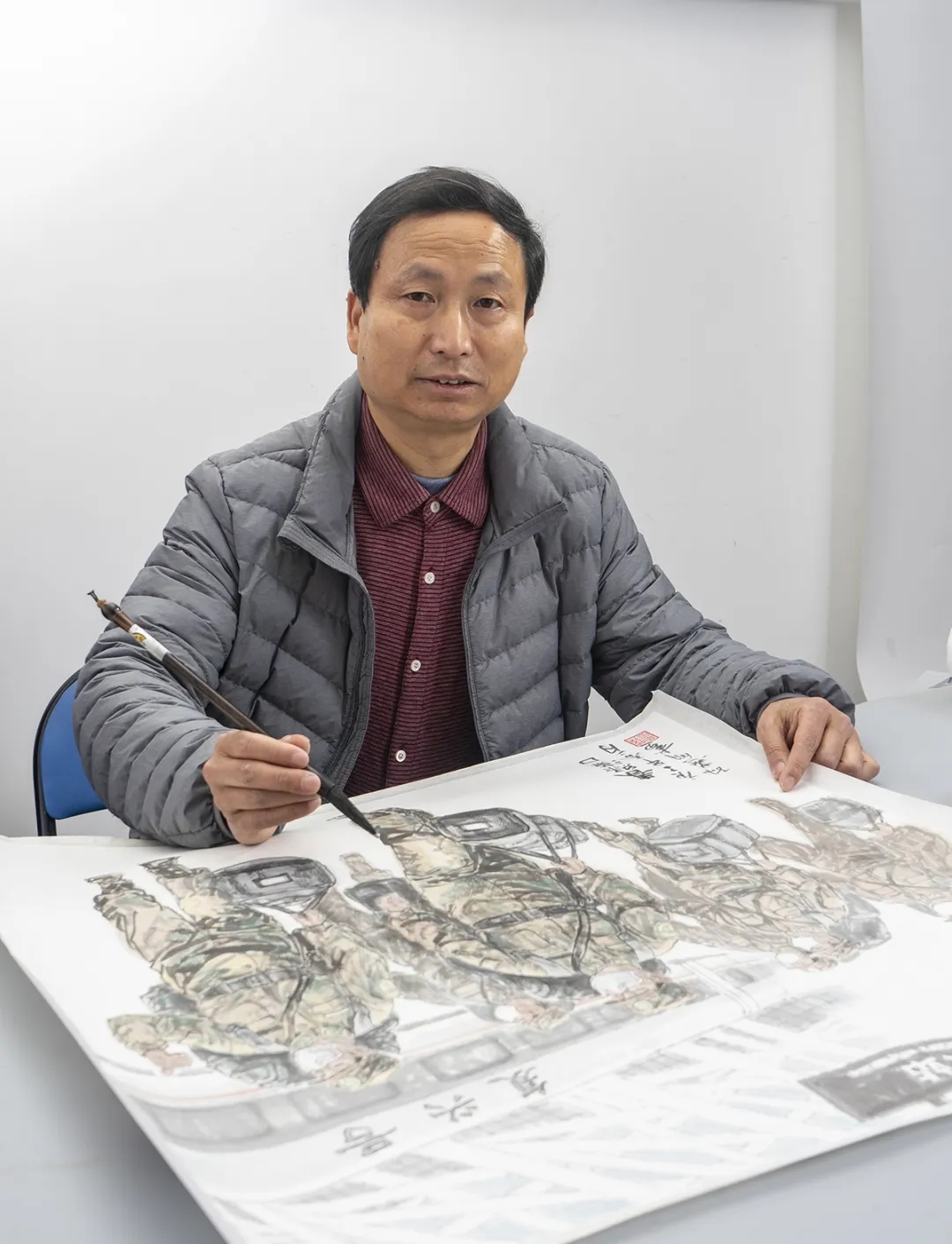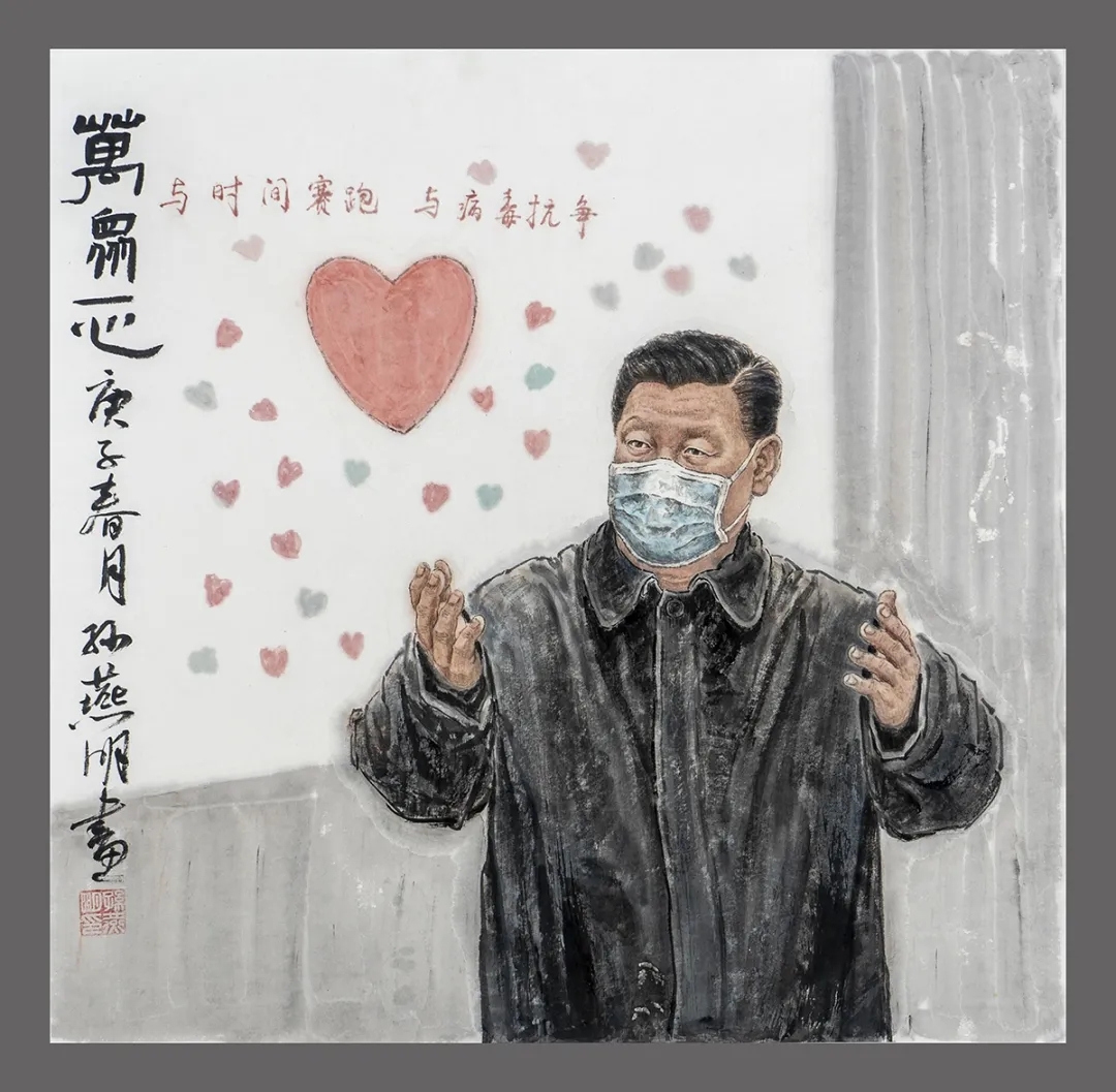 主旋律作品《万众一心》,特写了习近平总书记在北京疫情一线调研并发表重要讲话,举国振奋万众一心,众志成城。用国画技术塑造领袖人物孙燕明还是第一次,因而在生宣纸上小心翼翼地精心绘制,力求形神兼备。