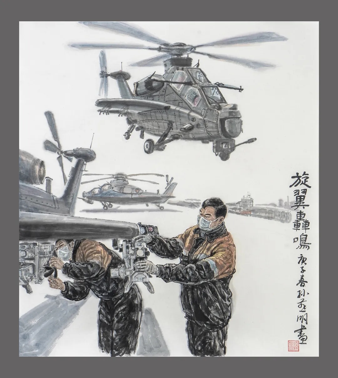 《旋翼轰鸣》,表现景德镇吕蒙机场昌飞线飞站机务人员正在加紧保障直10武装直升机“首飞”。疫情时期保障重点工程稳步复工复产有序进行。国画工写结合的技术中的墨韵湿染的方法,表现直升机的质感体积效果很好。
