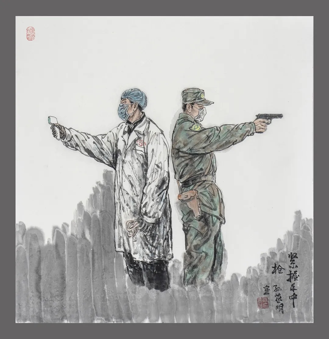 《铁门卫士》,表现了在疫情时期一线执勤的铁路警察克尽职守,把好城市高铁站的大门。手法上应用了工写结合的水墨造型,经营位置上主题人物一个铁警和二个保安构成了直立的山势,左画面上中下三块辅景分别和主景形成呼应对比。