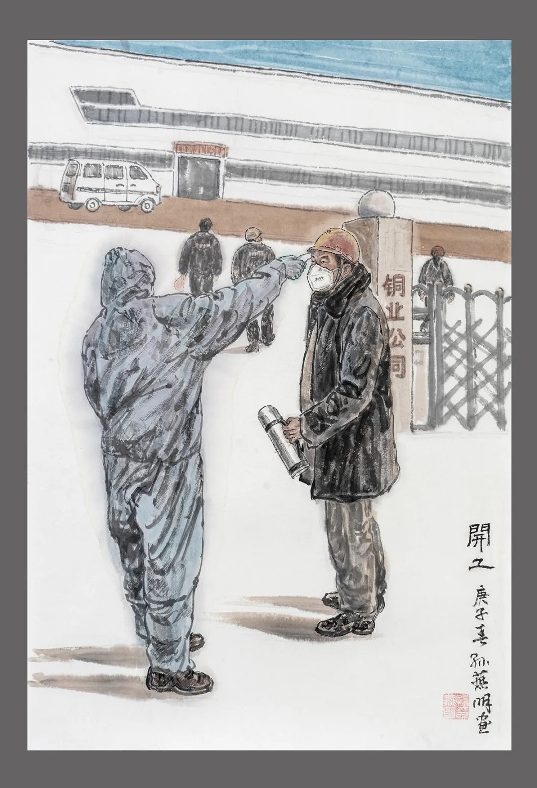 《开工》,表现了防控和复工之间的有序进行。复工生产的“集结号”缓缓吹起。表现了某铜业公司在严格防控措施中的职工逐个进厂工作的画面。水墨写意的技法,勾线再加染色。