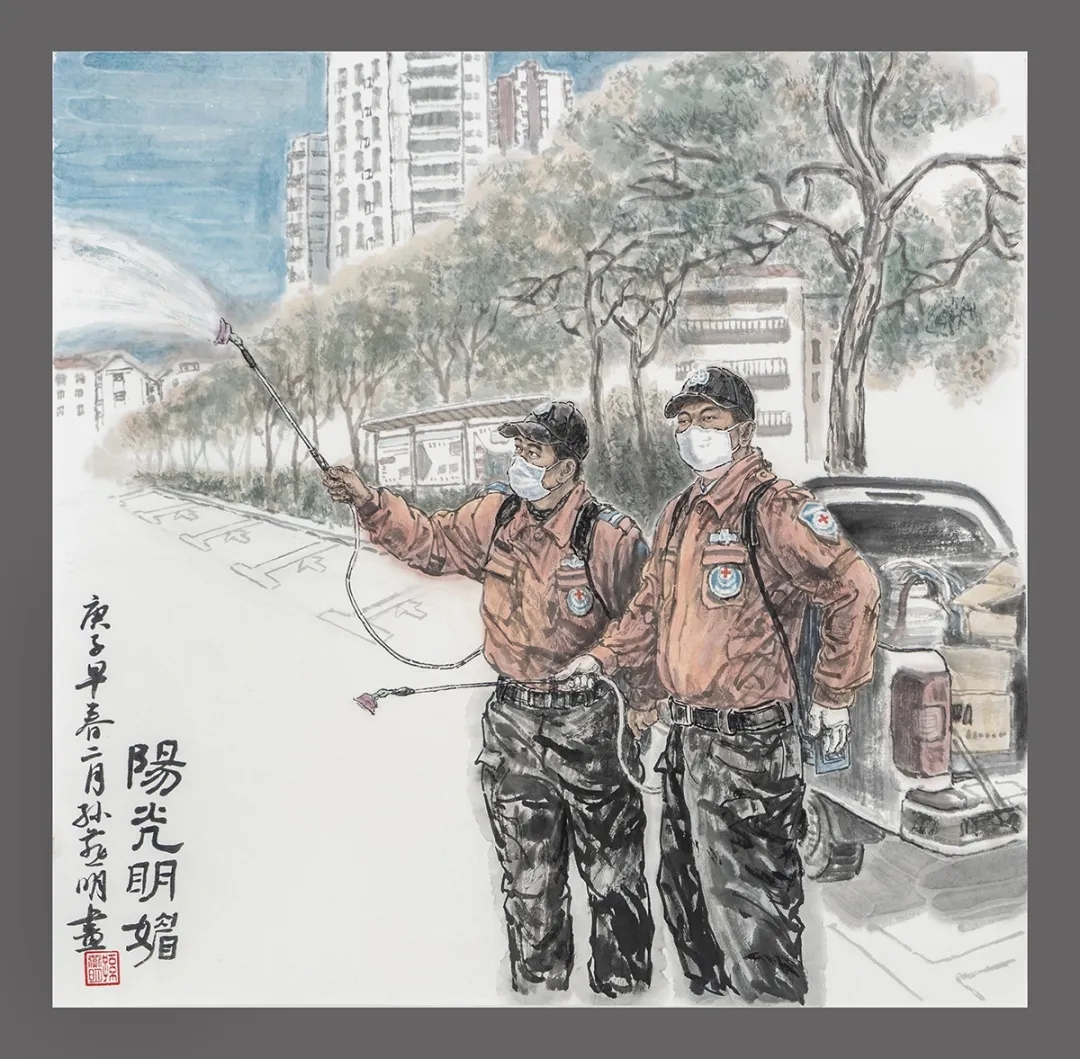 《阳光明媚》,表现了疫情时民间红十字救援队队员义务走街踏巷喷洒消毒水的情景。防疫时期民间组织的奉献精神。运用了国画小写意和大写意结合的艺术手法描绘,墨色干湿浓淡对比。特别是人物鲜艳的色彩和景物对比强烈,画面阳光灿烂生机勃勃。