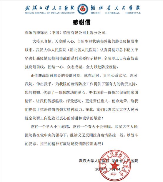 武汉大学人民医院致李锦记感谢信