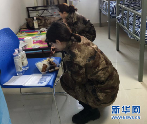 为了不把值班室的床单弄脏,郭婧颖和战友蹲着吃午饭。新华网 发(受访者供图)