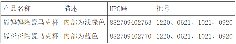 此次召回的产品于2020年12月-2022年5月在加拿大销售,熊爸爸陶瓷马克杯售出约7326个,熊妈妈陶瓷马克杯售出约8867个。