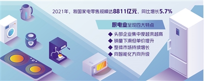 中国电子信息产业发展研究院日前发布的《2021年中国家电市场报告》显示,2021年,我国家电市场全面复苏,零售规模达到8811亿元,同比增长5.7%,整体基本恢复至疫情前2019年的水平。其中,消费升级激活高端市场成为拉动我国家电市场迅速走出低谷的重要引擎。