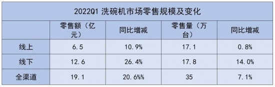 据奥维云网(AVC)推总数据显示,2022年一季度洗碗机零售额19.1亿元,同比增长20.6%;零售量35万台,同比增长7.1%。其中,线下市场表现突出,零售额同比增长26.4%,零售量同比增长14.0%。