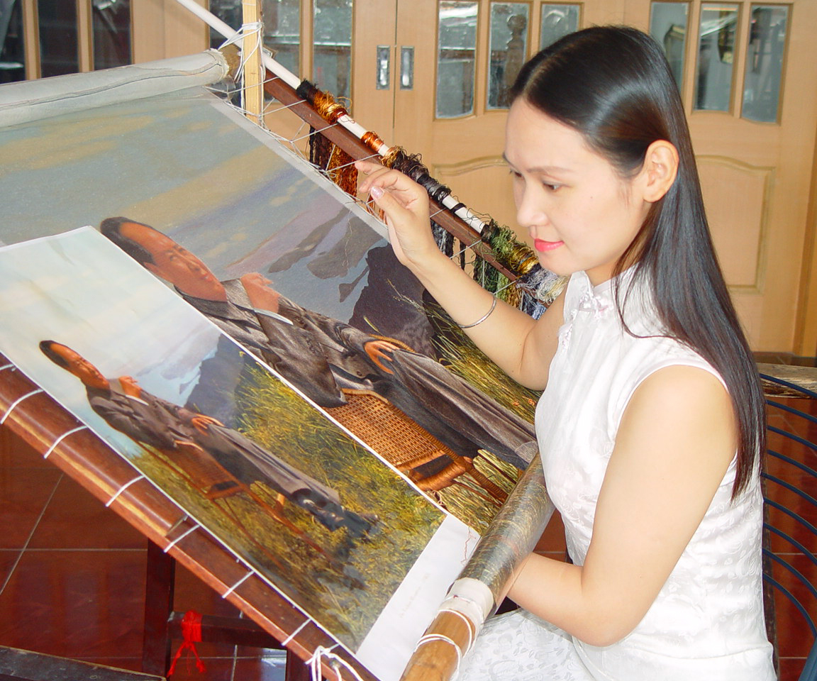 朱寿珍女士,中共党员,江苏省工艺美术大师、名人。国家级高级工艺美术师,中国工艺美术协会会员,世界艺术家联合总会会员,苏州刺绣艺术研究会理事,中国收藏家协会---刺绣艺术大师。一九六九年出生于水天共色的太湖之滨—苏州镇湖刺绣艺术之乡。自幼受先辈刺绣艺术感染,酷爱美术和中国刺绣艺术。一九八五年考入吴县刺绣研究所在镇湖承办的刺绣站,一九八六年被选入苏州市党校承办的《博雅艺院》,后就读于中国美院。研书理求美学,致用于苏绣艺术,兼纳百家之长,绣艺精进,形就自我风格,开宗立派,海内饮誉。朱寿珍的刺绣作品,乱针齐绣相融,针法细腻,色丰形真,把世界美学与刺绣艺术融为一体,使其作品达到新的艺术境界,特别是对人物、世界名画、动物、风景等作品已形成独特风格,开创中国刺绣艺术之新河。二十多年来,她的作品《毛主席在庐山》、《胡锦涛主席与江泽民主席亲切握手》、《印尼总统苏哈托“全家福”》、《英国女皇伊丽莎白》、《爱尔兰女总统》、《哈萨克斯坦总统》、《塔吉克斯坦总统》、《土库曼斯坦总统》肖像都被总统府收藏。《蒙娜丽莎》、《海边少女》、《非洲雄狮》、《鎏金佛祖》、《金香炉》、《博美犬》、《满瓶红花》等刺绣作品在全国工艺美术大师精品博览会荣获金奖。人物绣《毕加索》在英国第二十六届世界艺术节荣获三等奖。2003年至2005年带领40名学生绣制了二十幅《针尖上的法国印象》,2006年至2008年带领30余名学生绣制了十七幅《针尖上的克里姆特》曾在英国、法国、日本陆续展出受海内外名士一致赞赏。中央电视台、江苏电视台、浙江电视台、凤凰卫视、上海电视台、苏州电视台、《中国妇女》海外版、《中国青年》书刊《党的生活》书刊等新闻媒体兢相报道。