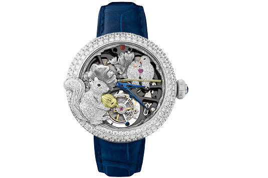 LOVE LOVE COLLECTION- Friends则以18k白金打造的松鼠和一双爱情鸟为主角,饰以18K黄金的松果及树枝,小松鼠手捧其喜爱的松果,而爱情鸟成双作对的互相依偎,中间加入抢眼的“爱心”,整个画面洋溢著幸福的感觉。镂空精钢表盘加入立体牡丹花雕刻图案,背景低调地展示出精密的机芯零件运作。此款腕表选用了永不过时的圆形腕壳,可爱的松鼠置于表壳之上,令设计更突出。指针和表带均选用优雅的蓝色,闪烁的美钻与6时位置的陀飞轮互相辉映,绽放高雅气质。万希泉为此系列腕表挑选了振频每小时达28800次的陀飞轮,走时稳定、精准,配合72小时动力储存机芯,令腕表真正做到内外兼备。