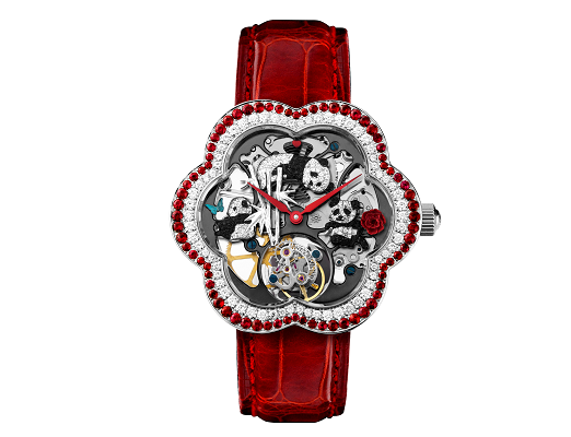 LOVE LOVE COLLECTION- Family以中国国宝熊猫为灵感,腕表面上有三只以黑白美钻铸造的熊猫,表盘则采用了万希泉最擅长的镂空雕刻技术打造茂密的竹林,让熊猫可以悠闲地享受大自然的乐趣。3时和9时位置上,分别饰以珍珠贝母打造的牡丹花和蝴蝶装饰作点缀,12时位置加入爱心图案,增强了腕表的层次感。腕表特地选用了富有中国色彩的茶花形表壳,表壳上饰以一圈红钻及一圈白钻,搭配鲜红色的指针及鳄鱼皮表带,雍容华贵。腕表配备60小时动力储存陀飞轮机芯,满足女士们的使用需求。