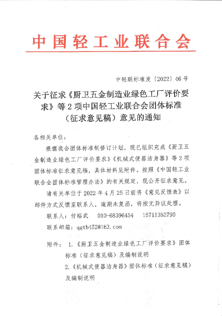 关于征求《厨卫五金制造业绿色工厂评价要求》等2项团体标准(征求意见稿)意见的通知