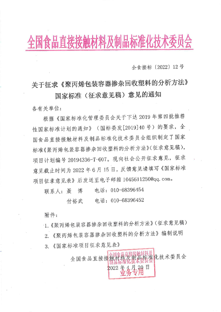 关于征求《聚丙烯包装容器掺杂回收塑料的分析方法》国家标准(征求意见稿)意见的通知