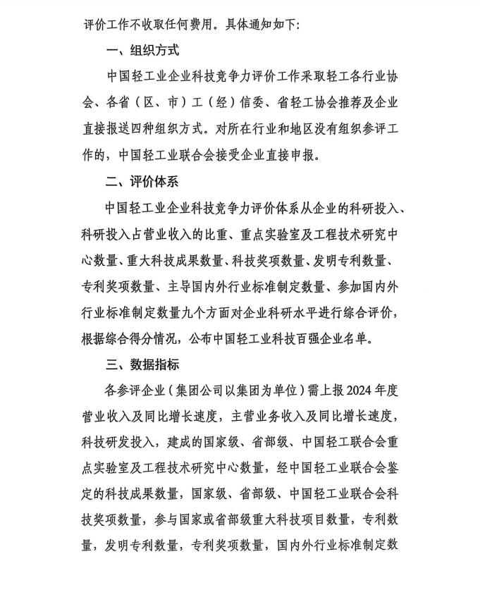 2024年度中国轻工业企业科技竞争力统计评价工作的通知