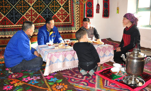 在“亲戚”加生别克·加马勒别克家里,甘昌华与其一家促膝交谈,仔细了解其家庭状况。加生别克的家在72团农试站,妻子待业,孩子尚小,日子过得甚是艰难。为贴补家用,曾经当过厨师的他工作之余与今年下半年开起了农家乐。盘腿坐在加生别克家炕上有些陈旧的地毯上,看着眼前摆着奶茶的小矮桌,当了解到加生别克家里缺一张供客人吃饭的大餐桌时,甘昌华当即承诺帮他做一张餐桌,让他安心工作。过后,甘昌华又参观了加生别克家里的羊圈。看到羊圈里有个门洞时,甘昌华让他把羊圈堵好,做好防范工作,并建议他在院子里多养些土鸡,供客人挑选,来提高农家乐收入。