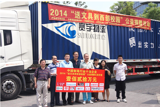 中国制笔行业十强企业“爱在路上 心在远方”2014 “送文具到西部校园” 大型社会公益捐赠活动发车仪式在上海举行