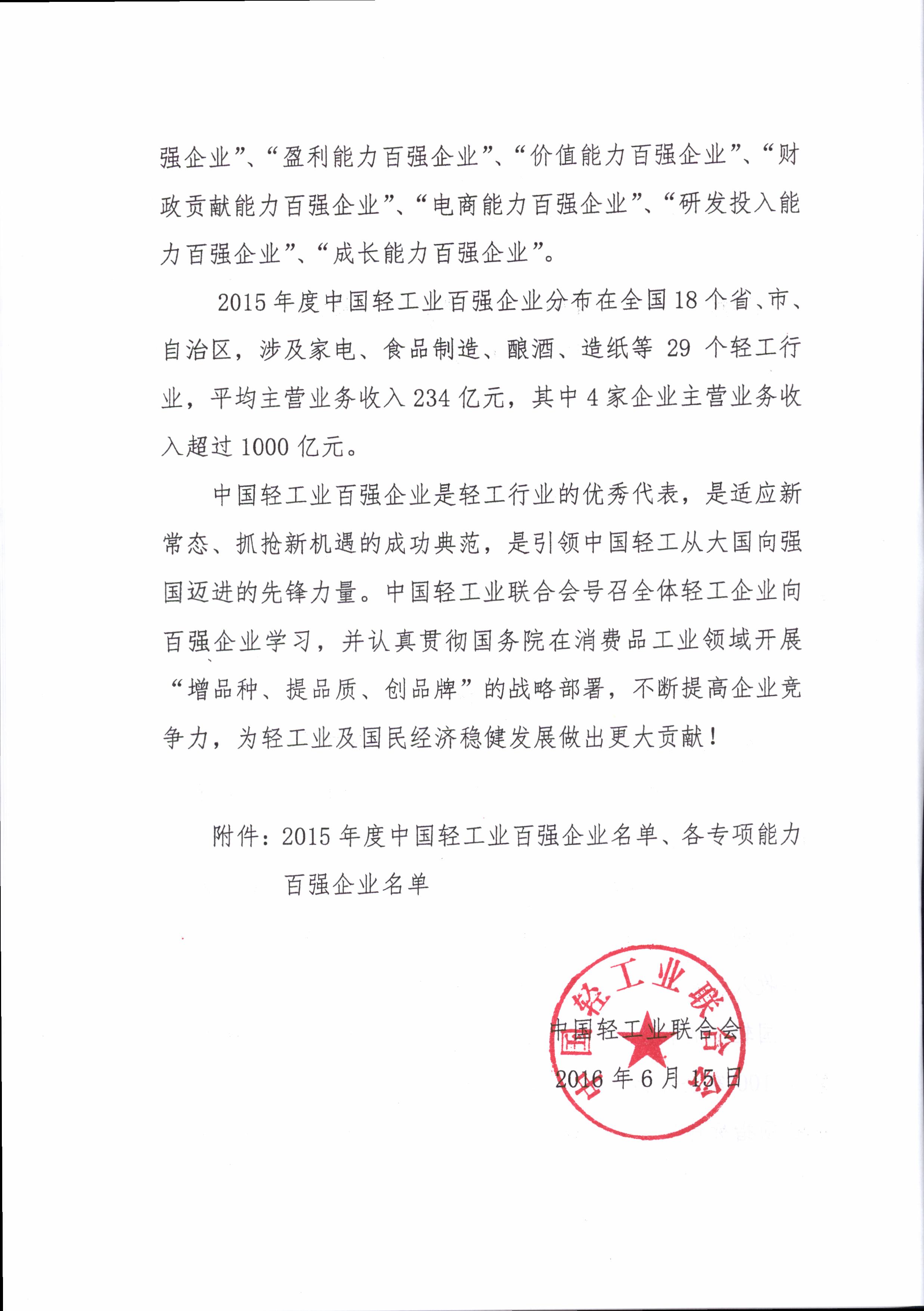 | 1、 | 2015年度中国轻工业百强企业名单、各专项能力百强企业名单 |