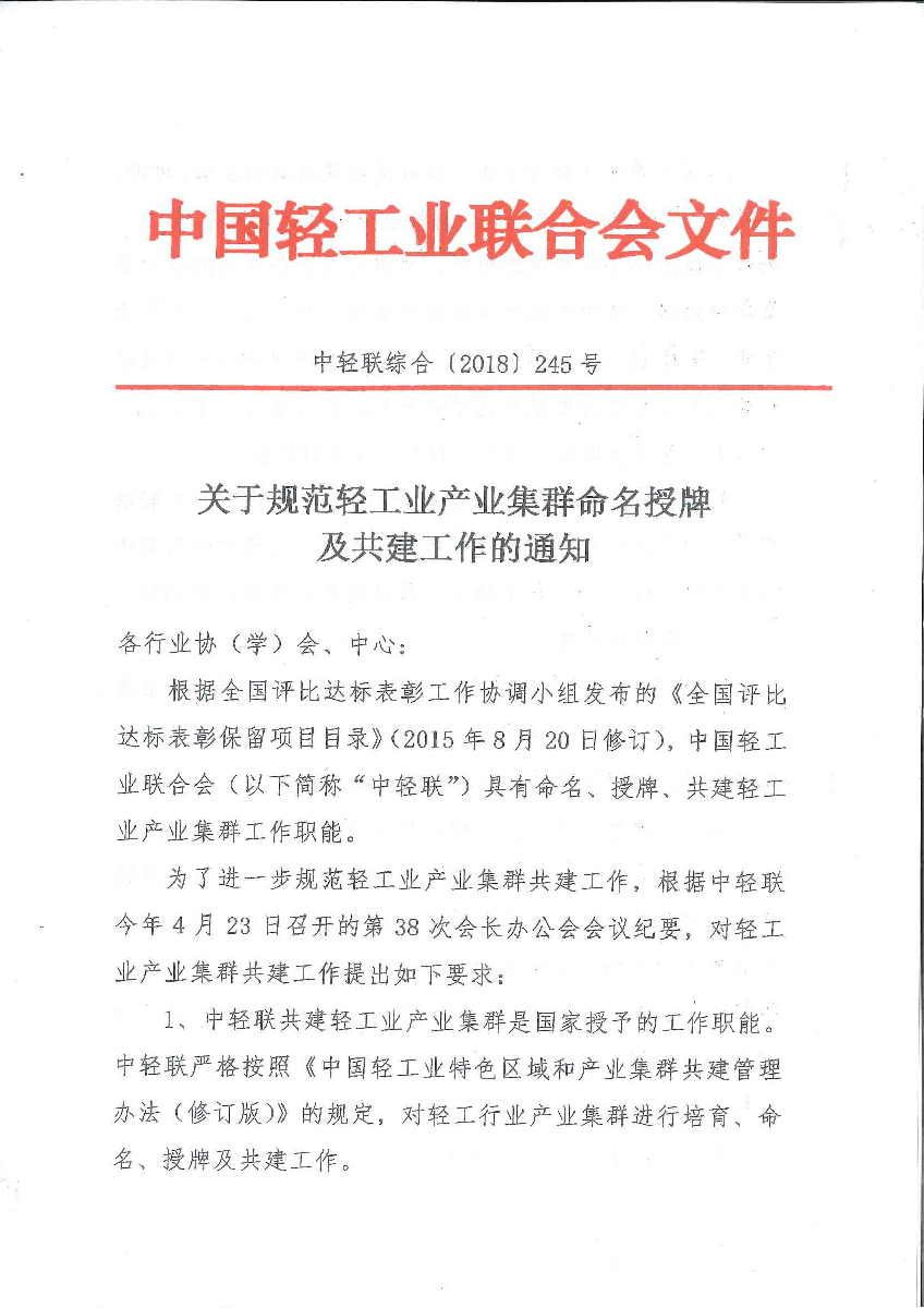 (以下简称“中轻联”)具有命名、授牌、共建轻工业产业集群工作职能。