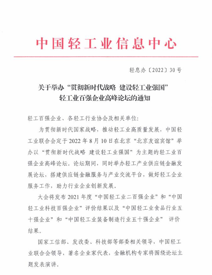 关于举办“贯彻新时代战略 建设轻工业强国”轻工业百强企业高峰论坛的通知