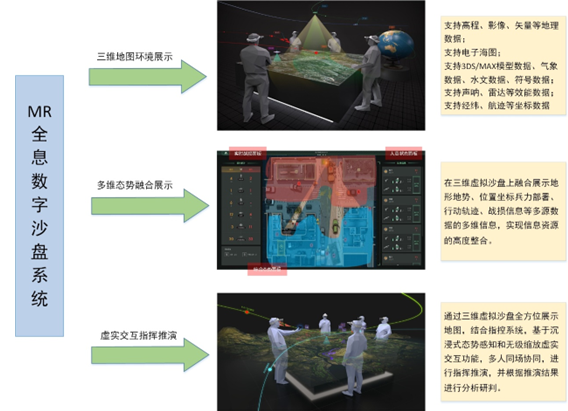 MR全息数字沙盘可配合电子沙盘的识图用图、军事基础训练、想定作业练习和作战推演,直观形象地显示海况、地貌、空情、海底地形、场景态势、场景氛围三维场景,模拟不同的气象、天候条件,提供精准重构战场局部模型、超高精度等比例还原细节、360°多视角查看战场态势、参数化动态加载三维单元要素等能力,并可自主调整属性设置智慧化推演,结合MR交互显示设备,为各层级指挥中心、指挥室提供直观、真实、立体、动态、可交互的三维战场环境态势场景,用于经典战役案例的模拟训练和热点地区未来战争样式的研讨式推演会商。