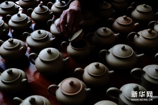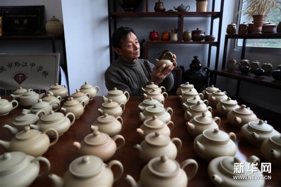 1月8日,在重庆市黔江区濯水镇三门社区,村民刘沛良检查茶壶质量。