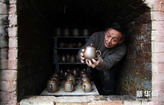 1月8日,在重庆市黔江区濯水镇三门社区,村民刘沛良观察出窑茶壶的烧制情况。
